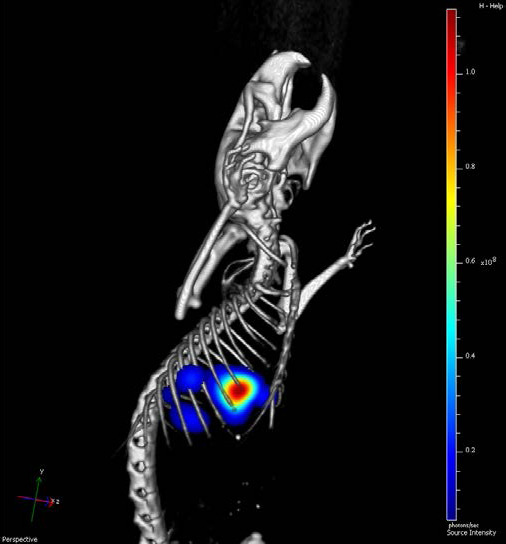 図12. マウスの肺に移植されたIVISense腫瘍細胞株のIVIS Spectrumによる光イメージングとGX IIIによるCT画像の融合